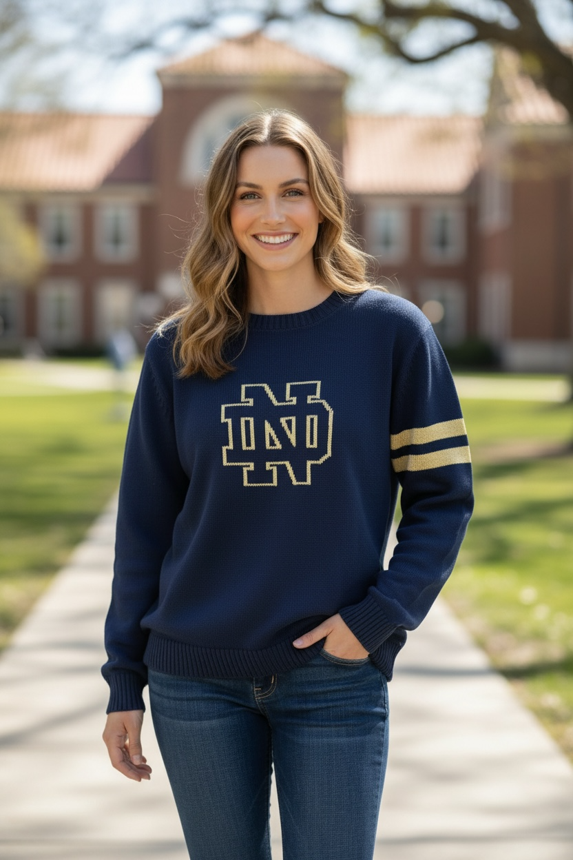 Show your love for the Irish in this classic navy 100% cotton sweater. This crew neck sweater has a lucky gold shimmer in the yarn with a shamrock on the back. Go Irish!
